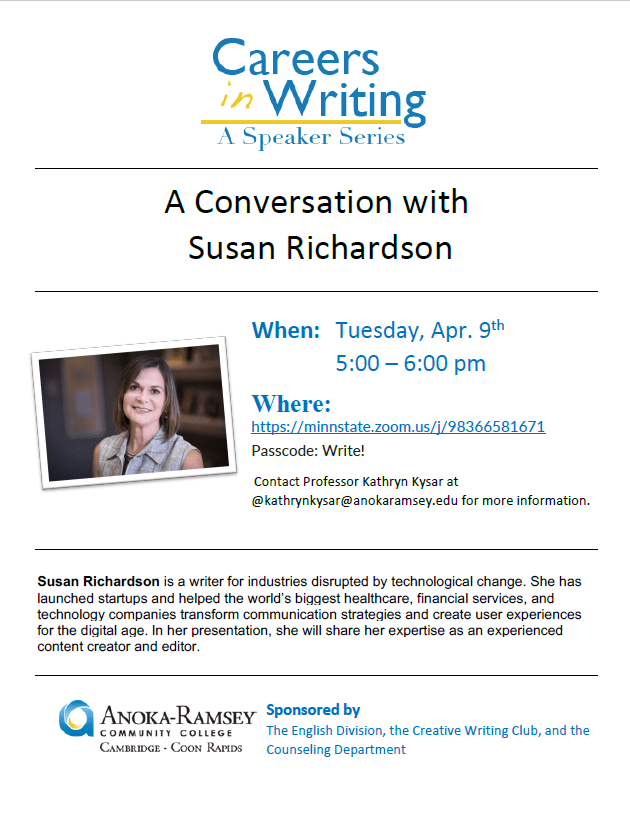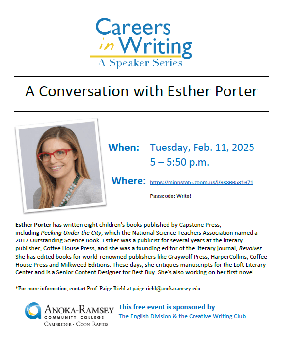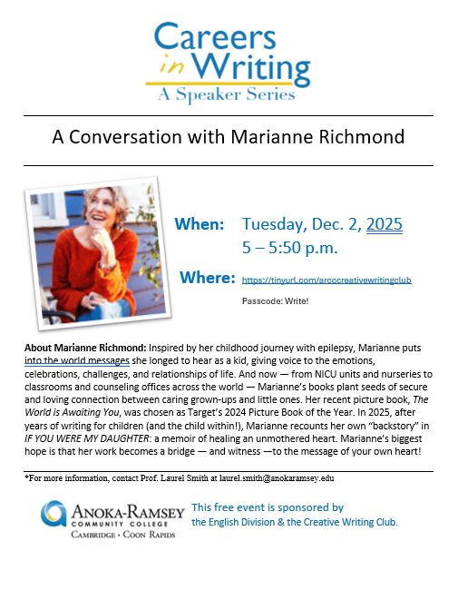 Careers in Writing Alumni Event--Tuesday, November 14 (2023) from 5-6 p.m. on Zoom. Hear from Anoka-Ramsey Alumni about their career paths, publications, and more! More information coming soon.