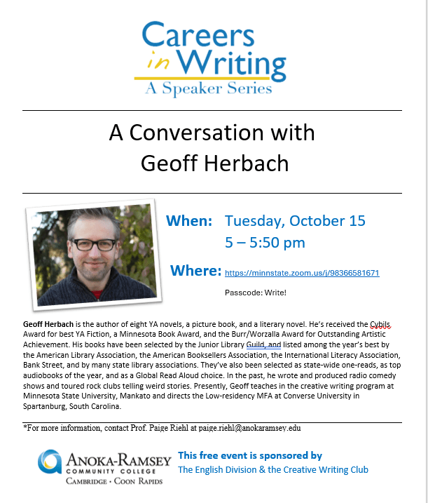 Careers in Writing featuring Geoff Herbach, author of YA fiction, children’s books, and literary fiction on Tuesday, October 15 at 5 p.m. (2024) on Zoom, hosted by the Anoka-Ramsey Creative Writing Club.