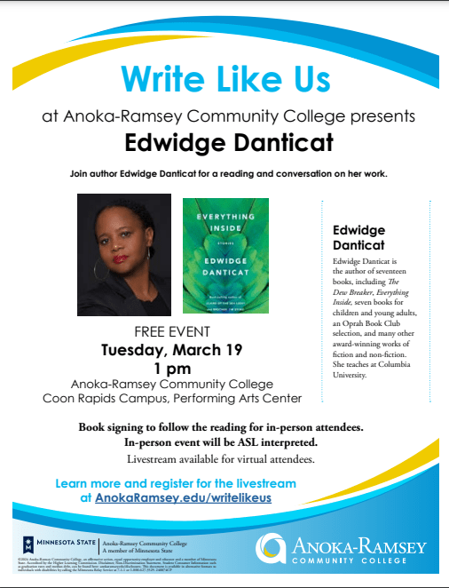 Write Like Us featuring author Edwidge Danticat: Tuesday, March 19 from 1 – 2 p.m. in the Performing Arts Center (PAC), Rapids Campus. Free and open to the public. The event will also be livestreamed as well. Click here to register for the livestream: https://minnstate.zoom.us/webinar/register/WN_BAyybKEMQ-WWwH7cSekntQ