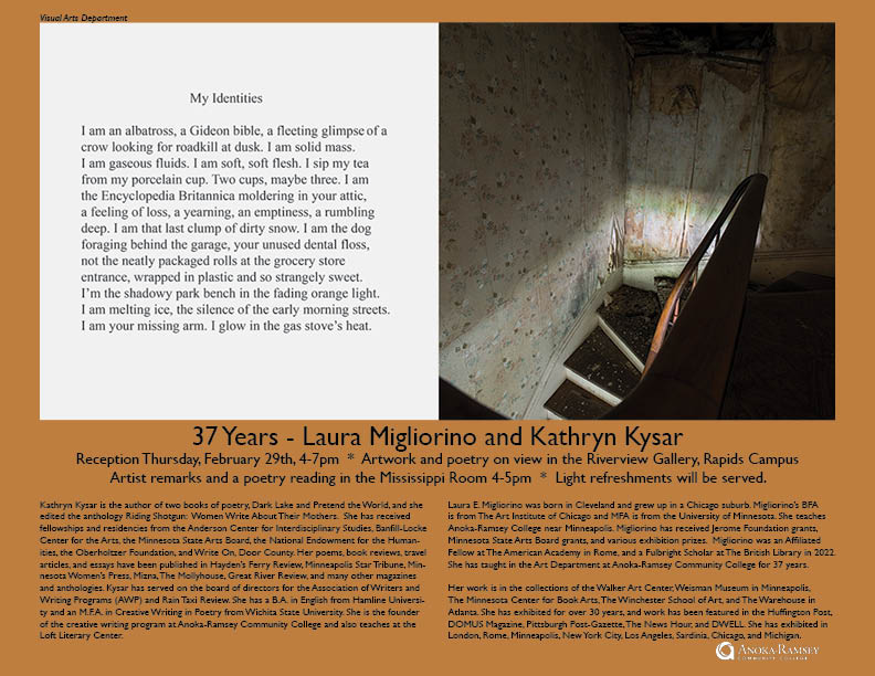37 Years Art Exhibit and Poetry Reading with Anoka-Ramsey Art Faculty Laura Migliorino and English Faculty Kathryn Kysar: Thursday, February 29 from 4 – 5 p.m. in the Riverview Gallery, Rapids Campus. Join us for a reception, artist remarks, and a poetry reading with light refreshments.
