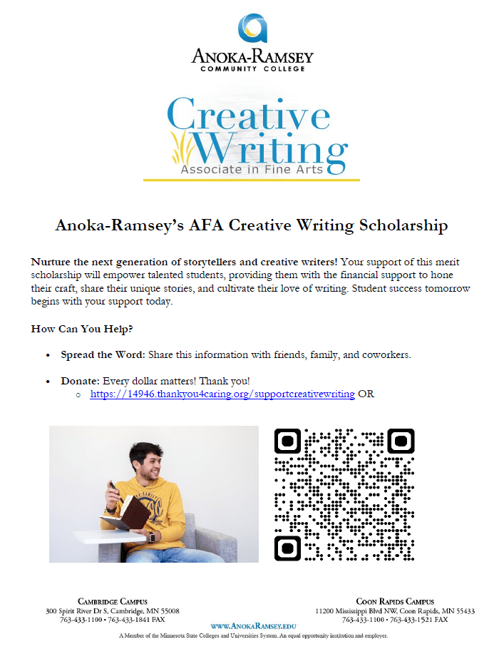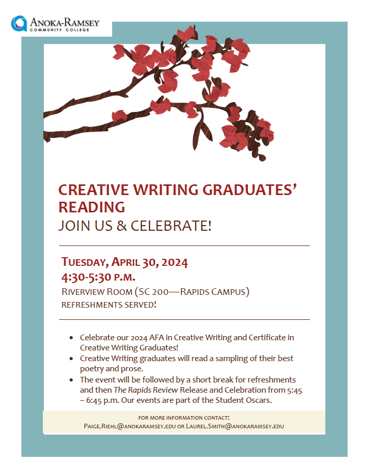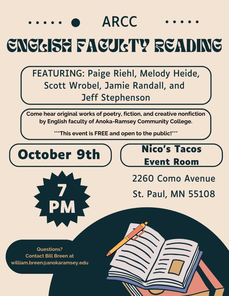 Saturday, October 19 from 10 a.m. – 5 p.m.: Stop by the Anoka-Ramsey English Department’s table at the Twin Cities Book Festival’s Book Fair! Creative writing faculty and students will be available to answer questions about our degrees and classes, and we’ll have brochures and more to share: https://twincitiesbookfestival.com/