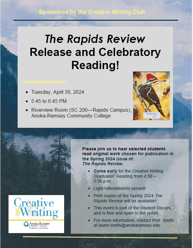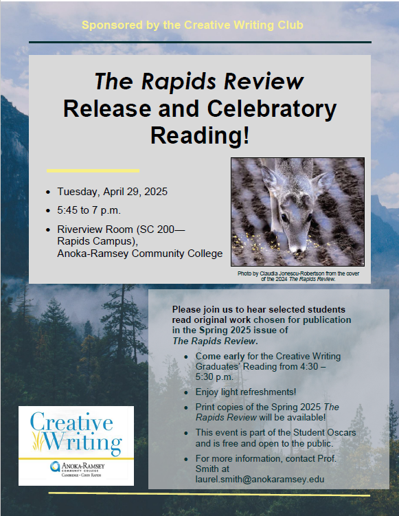 Tuesday, April 30 at 5:45: The Creative Writing Club invites you to The Rapids Review Release and Celebratory Reading! Copies of the new The Rapids Review will be available.