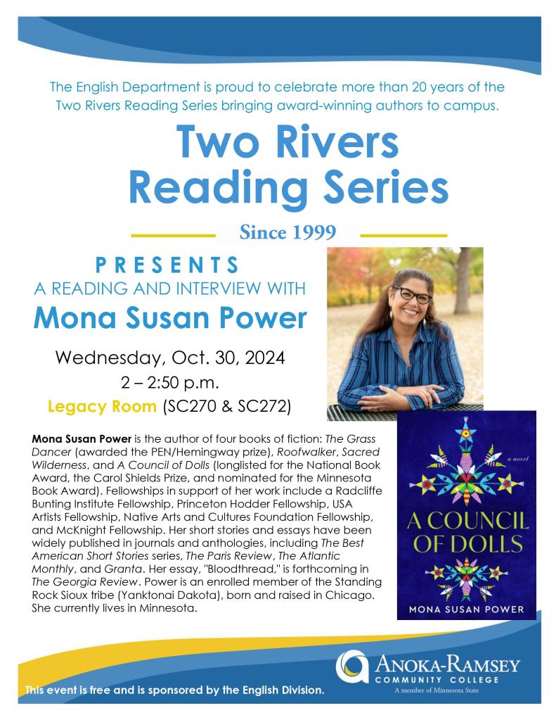 Wednesday, October 30 at 2 p.m.: Anoka-Ramsey is pleased to feature award-winning author Mona Susan Power as the featured author for the Two Rivers Reading Series! She will read from and discuss her Minnesota Book Award Winning novel A Council of Dolls: