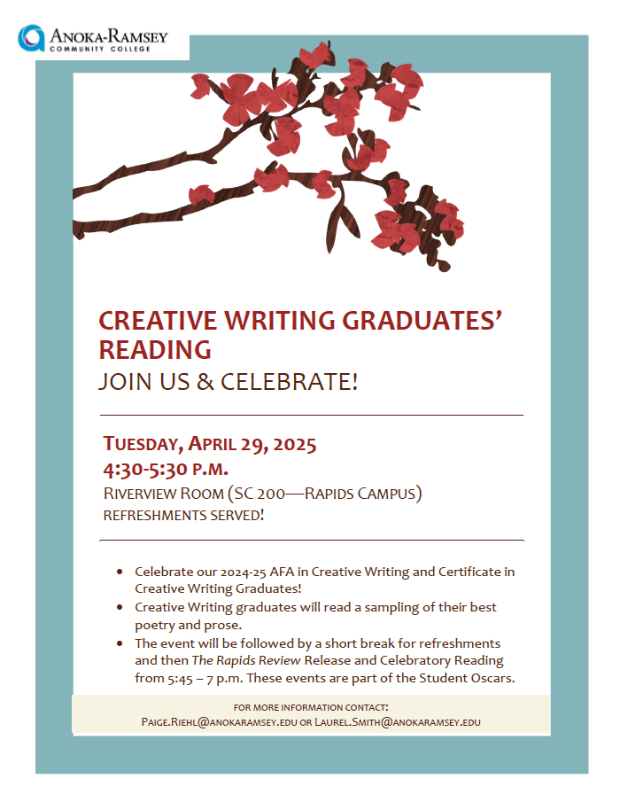AFA Graduate Reading & Rapids Review Release Party: Tuesday, April 30 from 4:30 – 6 p.m. in the Riverview Room, Rapids Campus. This event is part of the Student Oscars, and it’s free and open to the public.